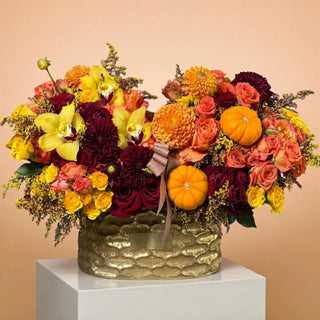 - Haunted Harvest Centerpiece: A seasonal mix inspired by our Smashing Pumpkins recipe, featuring vibrant orange blooms, marigolds, cremons, coxcomb, and festive mini pumpkins. It’s the perfect blend of autumn warmth and moody charm.