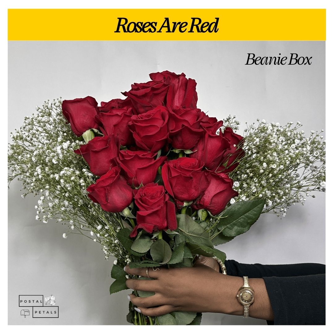 Roses Are Red - Beanie Box comes with two dozen Red Roses and one bunch of Baby’s Breath