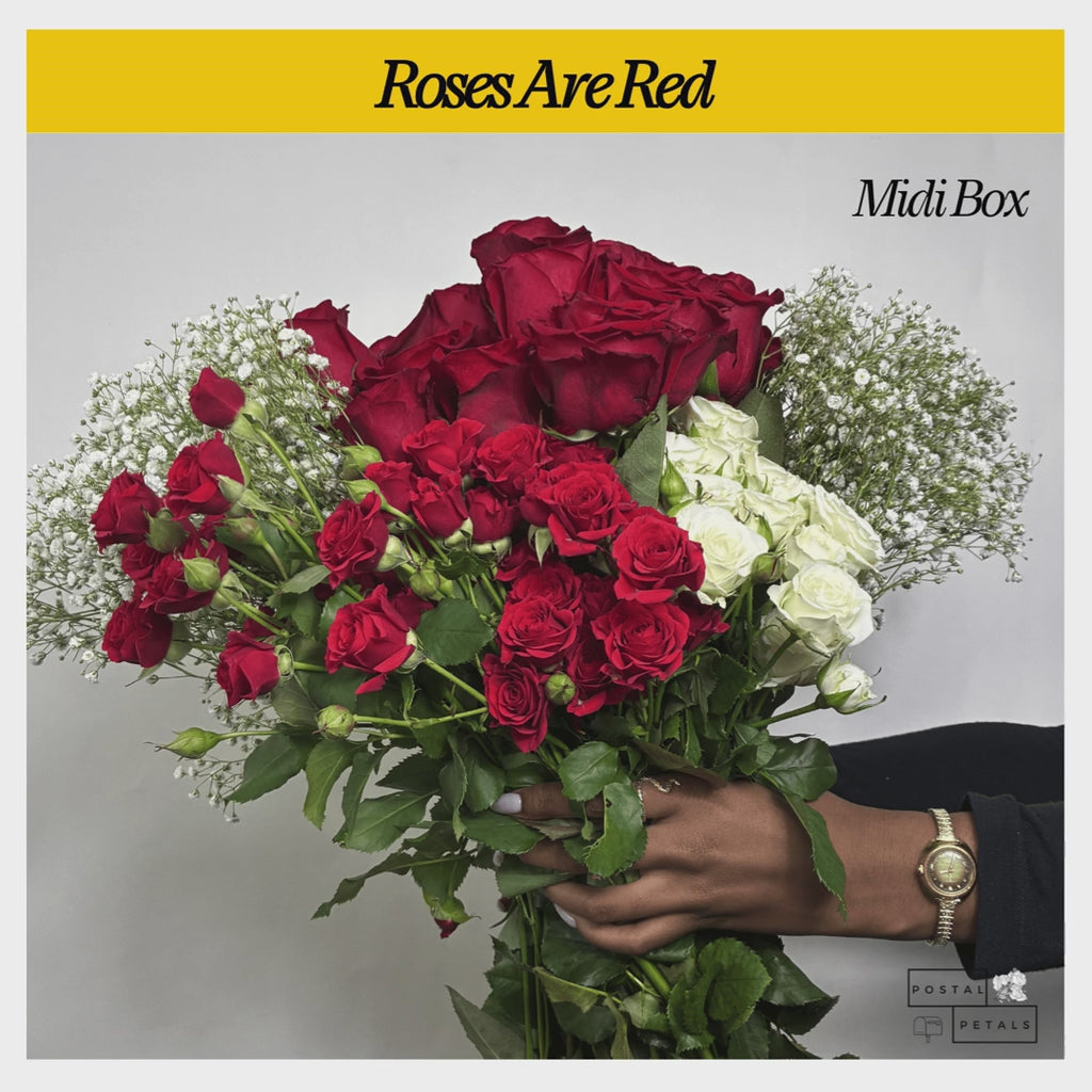 Roses Are Red - Midi Box comes with everything listed in the Beanie Box, plus one bunch each of White and Red Spray Roses