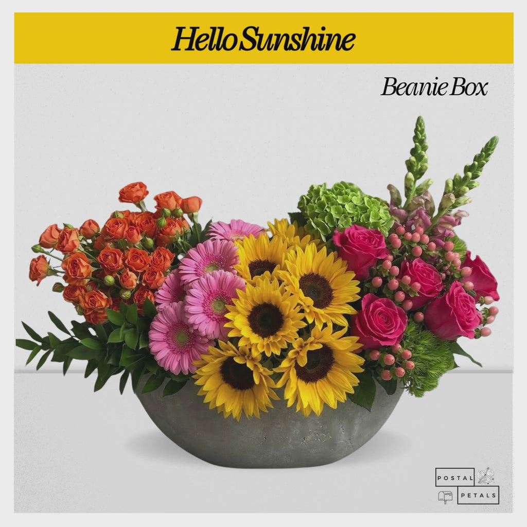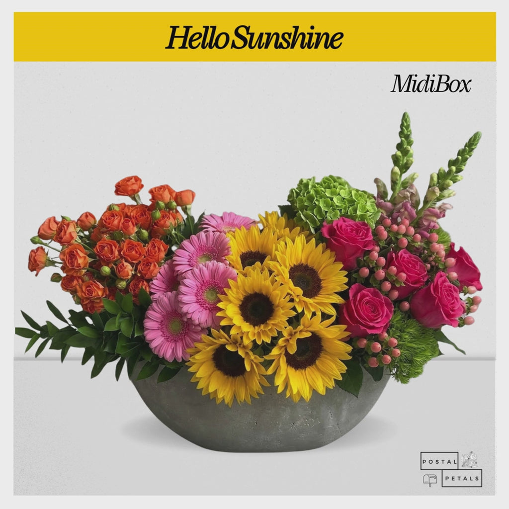 Hello Sunshine - Midi Box comes with everything listed in the Beanie Box, plus one bunch each of Sunflower, Mini Gerbera Daisies and Mini Hydrangea