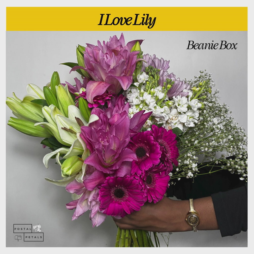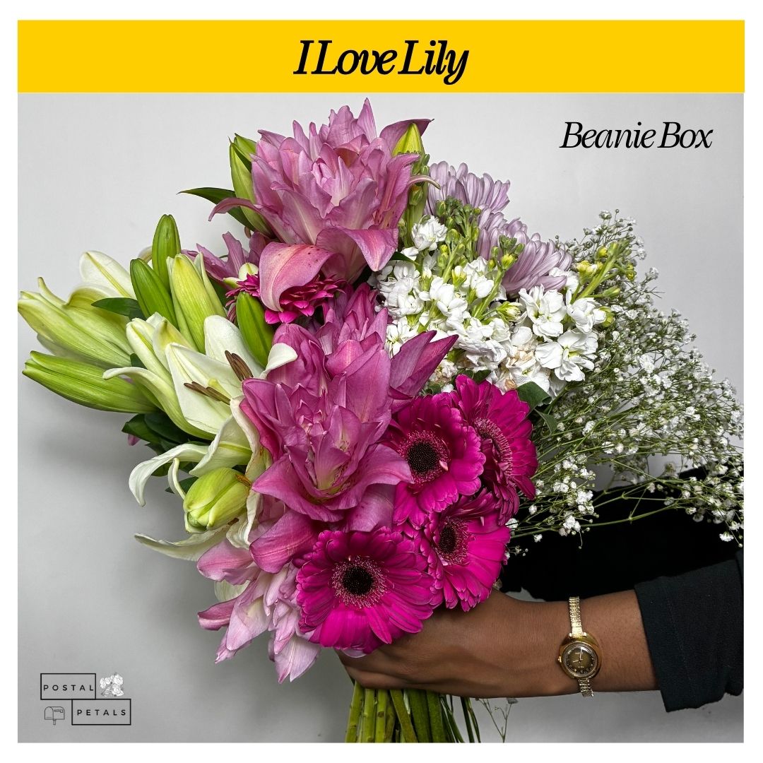 I Love Lily - Beanie Box comes with two bunches of Rose Lily, plus one bunch each of Stock, Cremons, Mini Gerbera Daisies, and Baby’s Breath