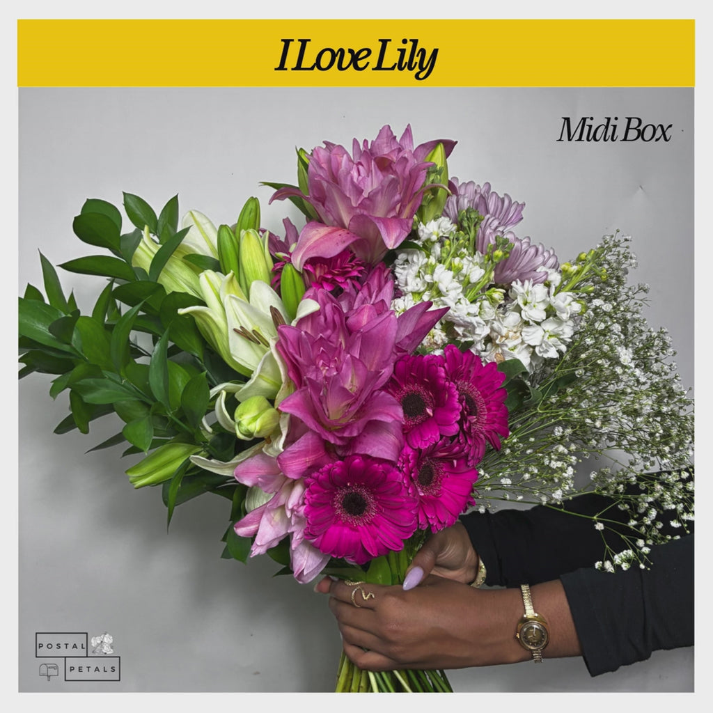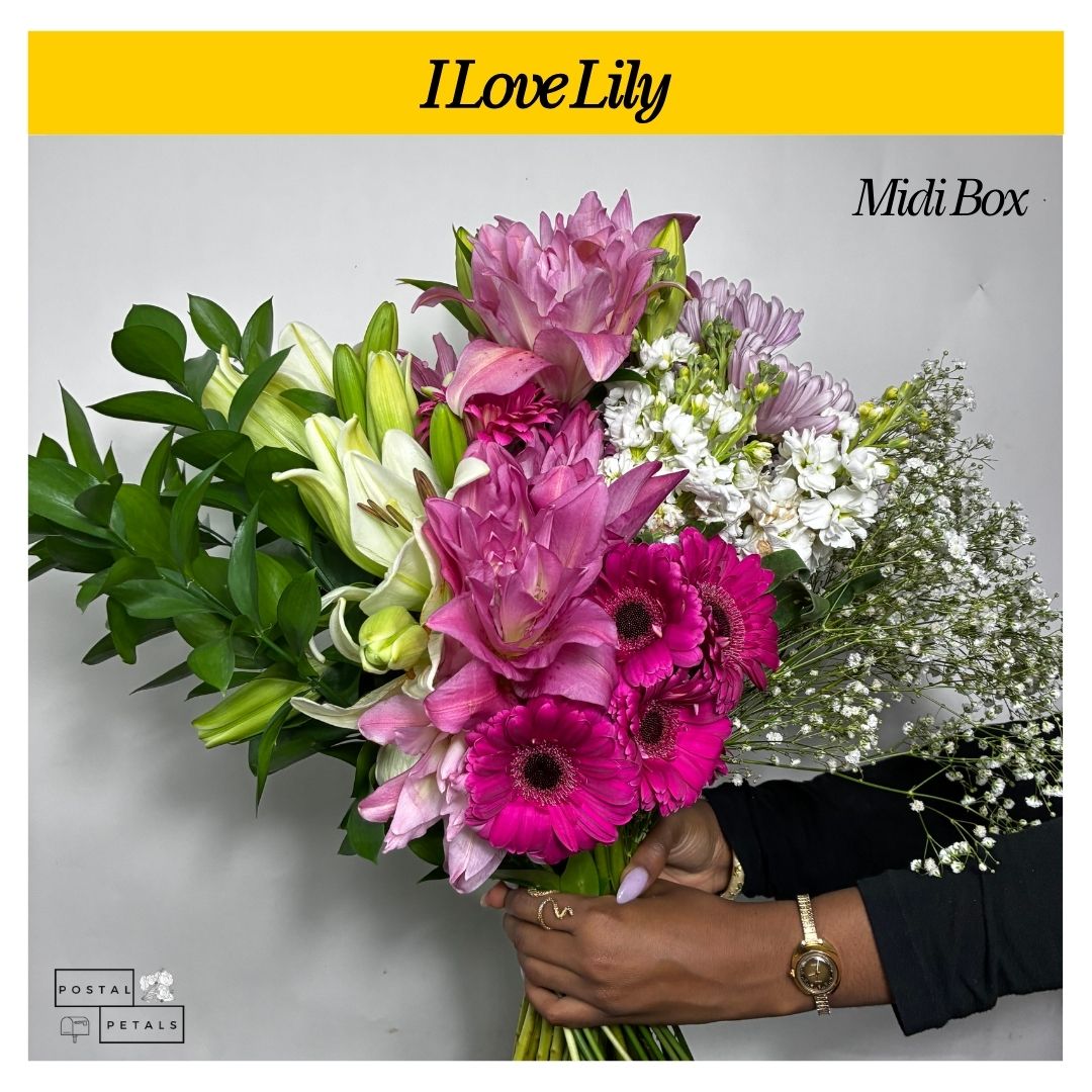 I Love Lily - Midi Box comes with everything listed in the Beanie Box, plus two bunches of Rose Lily and one bunch of Ruscus Israeli