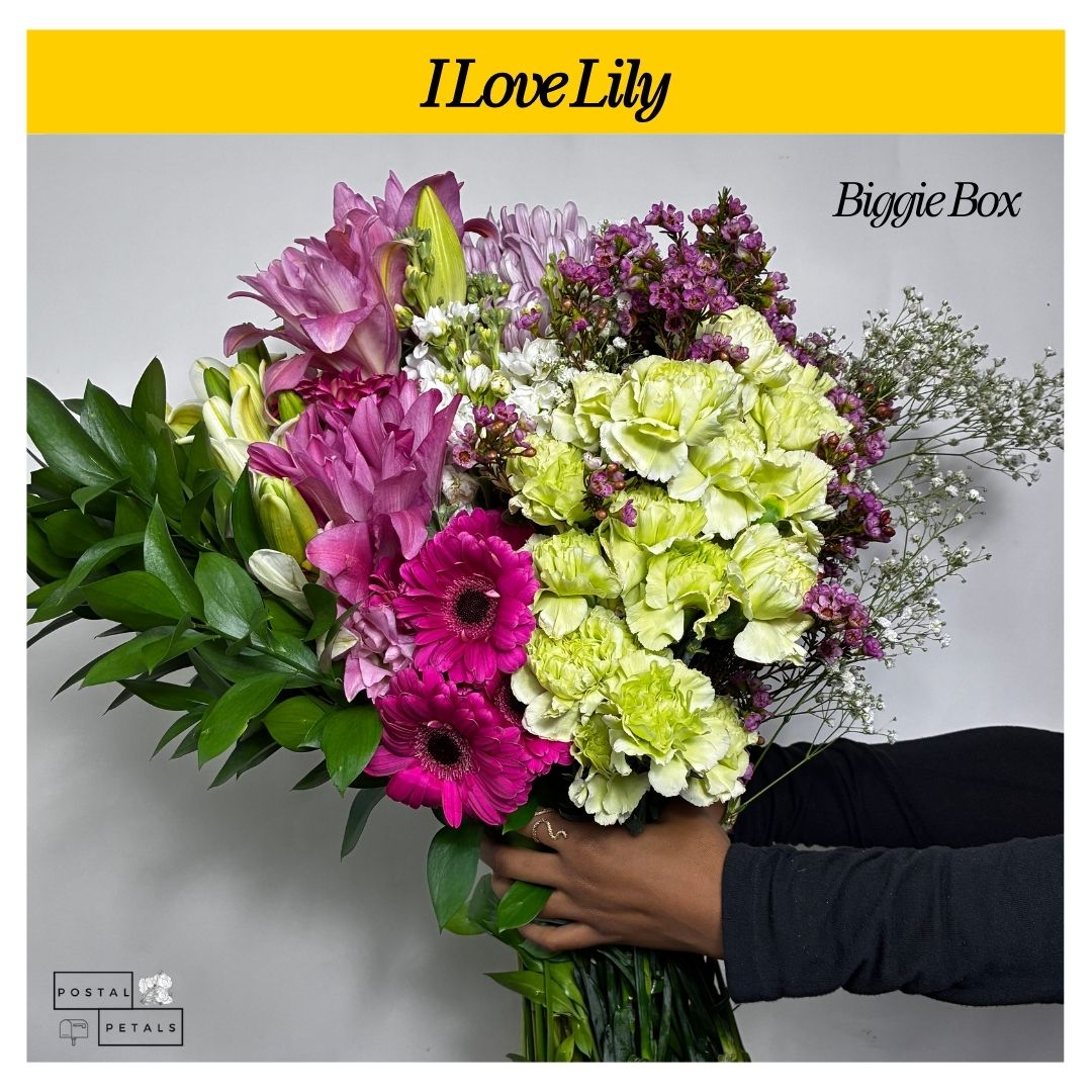 I Love Lily - Biggie Box comes with everything listed in the Midi Box, plus two dozen Carnations, and one bunch of Waxflower