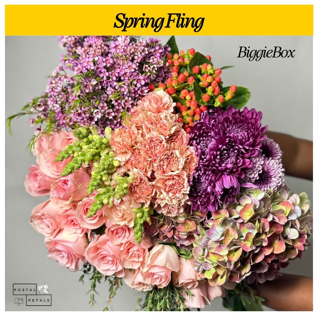 Spring Fling is a fresh and flirty mix of classic and whimsical blooms. Two dozen lush Roses and Hydrangea bring romance and fullness. Snapdragons and Veronica add height and a playful twist, while Cremons and Disbud Balls create a soft, rounded texture. Carnations offer timeless charm, Hypericum adds berry-like pops, and Waxflower brings delicate detail. Eucalyptus Parvifolia finishes it off with airy, fragrant greenery.