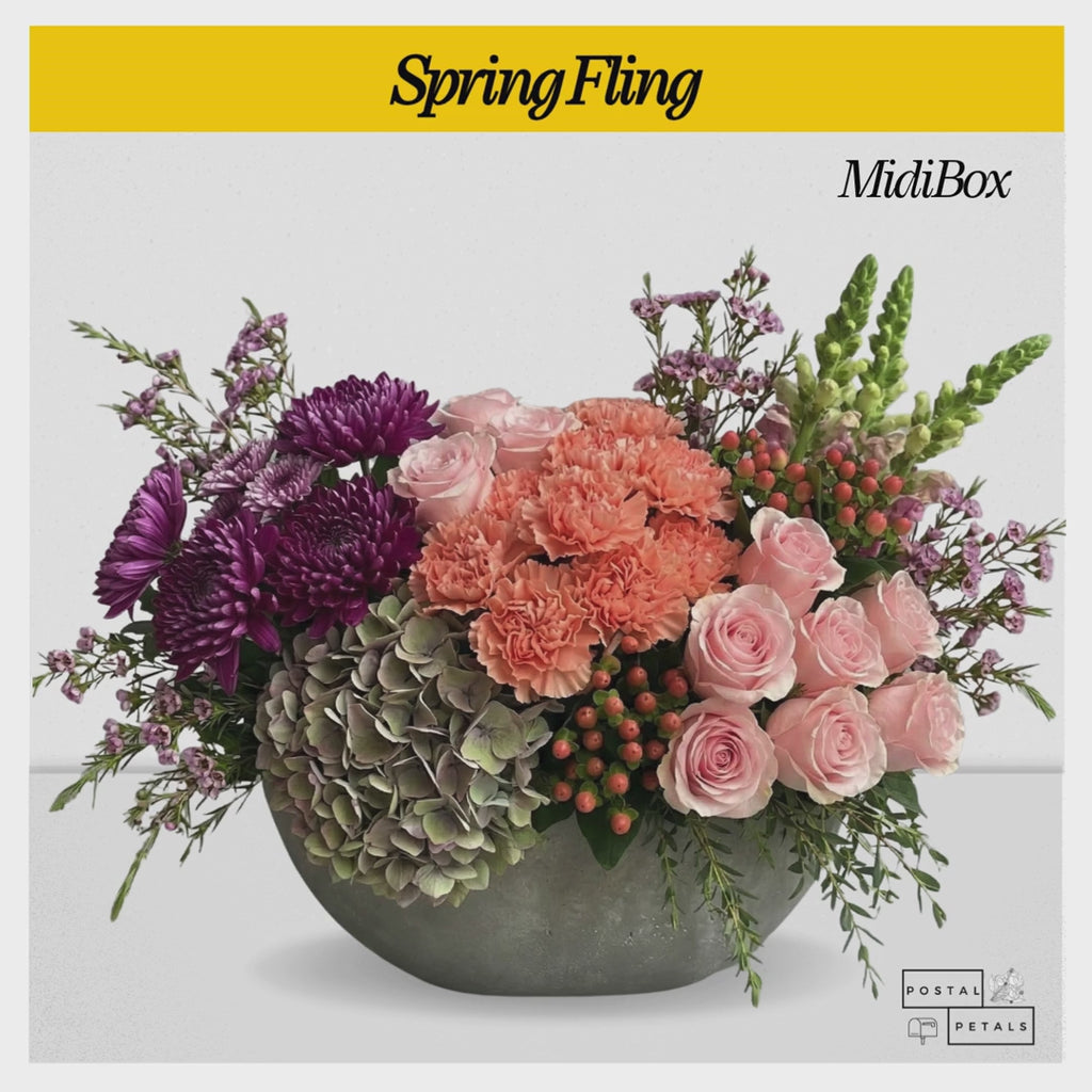 Fall head over heels for Spring Fling, a dreamy DIY Bloom Box blooming with Roses, Hydrangea, Snapdragons, Cremons, Waxflower, and lush Eucalyptus.